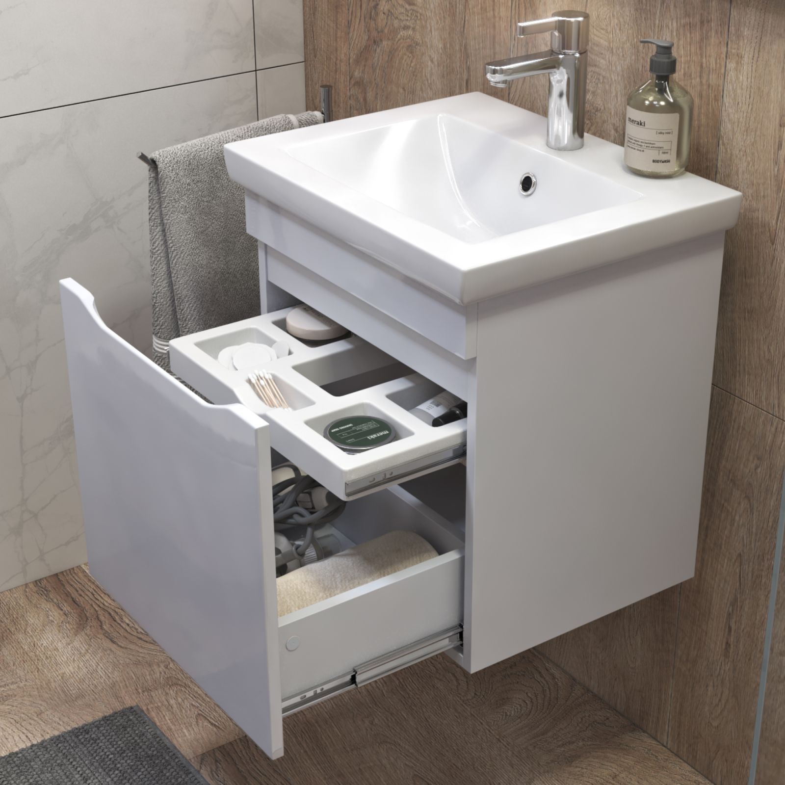 1 ящик, выдвижной органайзер для мелочей, направляющие шариковые полного выдвижения, 2 навеса, 1 сифон